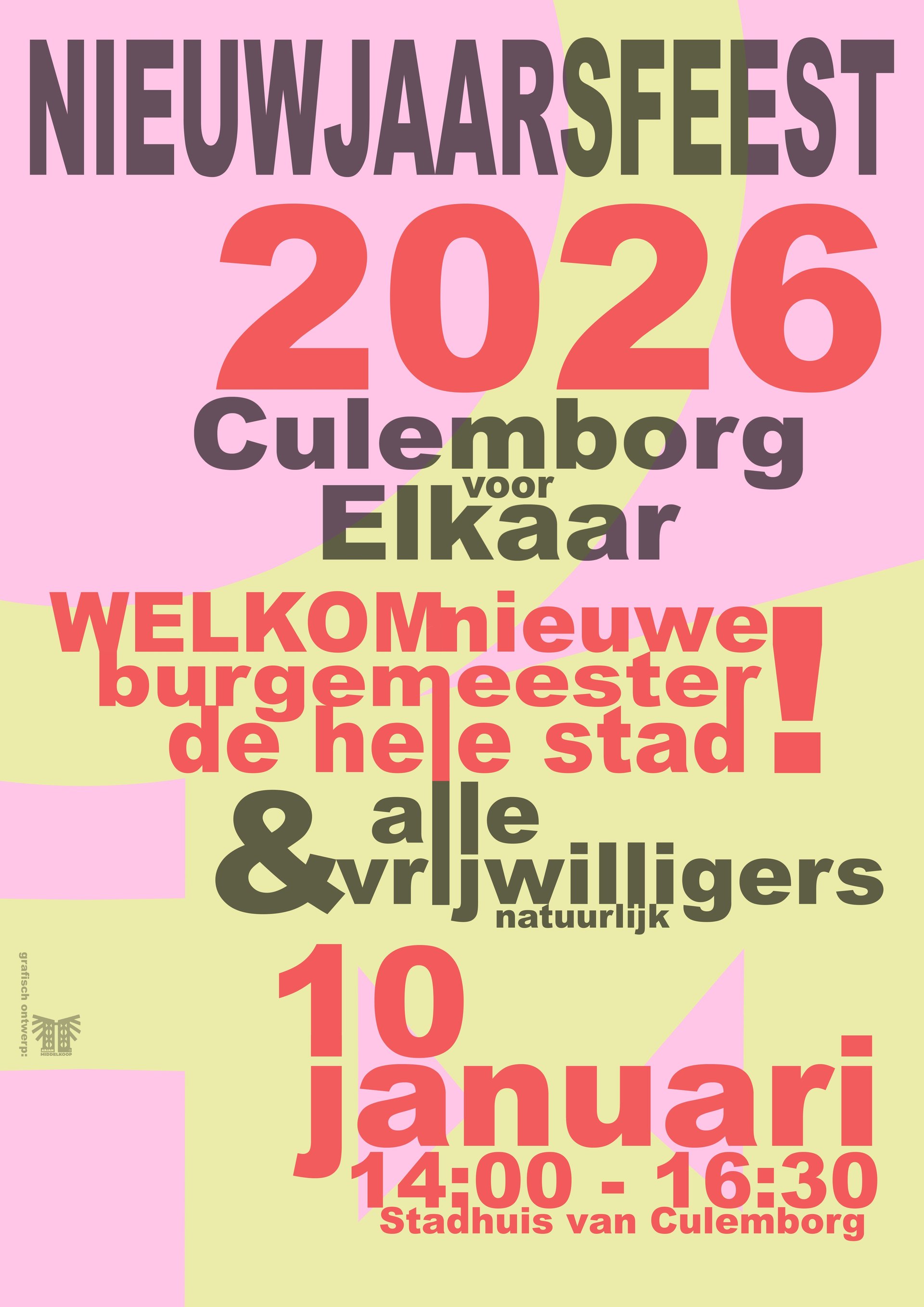 De nieuwjaarsbijeenkomst is hét jaarlijkse moment om als stad samen vooruit te kijken en successen te vieren. Iedereen in Culemborg is dan ook van harte uitgenodigd. Dit jaar is de bijeenkomst extra bijzonder, want we maken kennis met onze nieuwe burgemeester en we staan stil bij de vele vrijwilligers in onze stad. 2026 is internationaal uitgeroepen tot het jaar van de vrijwilliger.